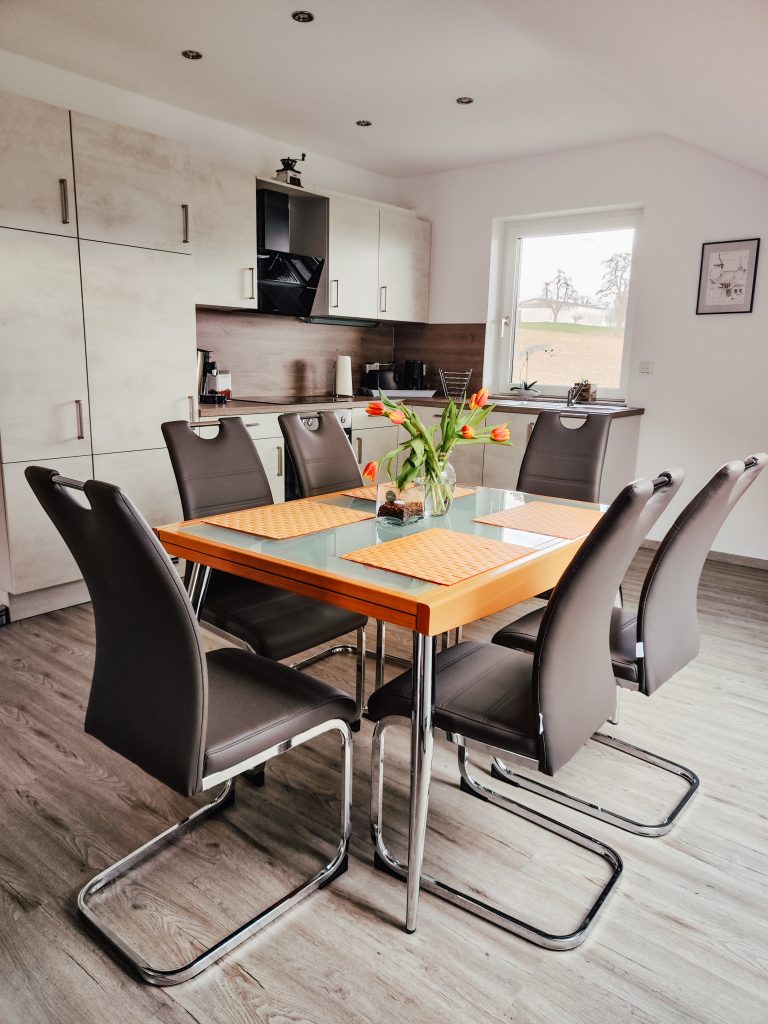 Sehr schöne neu errichtete Ferienwohnung mit Blick südlich ins Salemer Tal und nördlich auf Schloss Heiligenberg. Ein Exkurs, seine Seele baumeln zu lassen oder aber mit dem Rad die Natur rund um den Bodensee zu erforschen.